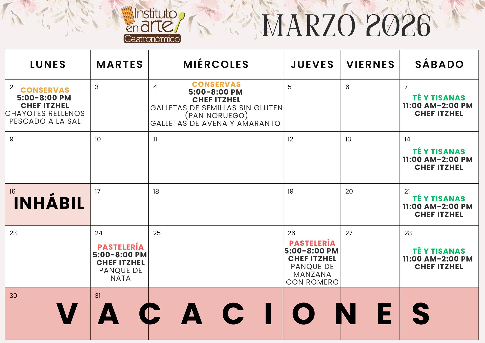 Cada mes publicamos el calendario mensual de clases, donde podrás consultar fechas, horarios, temas y costos; este calendario